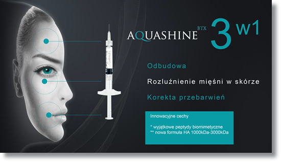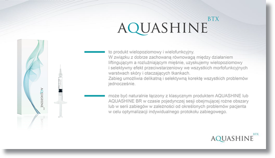 Aquashine BTX™ to innowacyjny produkt zapewniający kompleksowe rozwiązania w terapii przeciwstarzeniowej. Aktywnie stymuluje regenerację i odnowę komórkową, poprawiając strukturę skóry. Kompleks peptydowy stabilizuje aktywność mięśni w skórze, rozluźnia włókna mięśni mimicznych, powodując wygładzenie skóry. Zawarty w Aquashine BTX™ kwas hialuronowy głęboko nawilża i wspomaga zdolność peptydów do penetracji, przedłużając ich działanie.